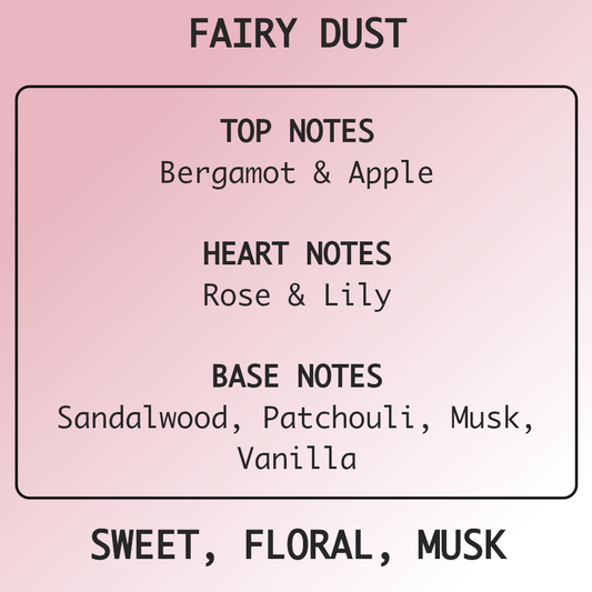 Fairy Dust will transport you to a world of enchantment and whimsy. With top notes of bergamot and apple, heart notes of rose and lily, and base notes of sandalwood, patchouli, musk and vanilla, this sweet, floral, and musky scent will create a truly magical atmosphere.